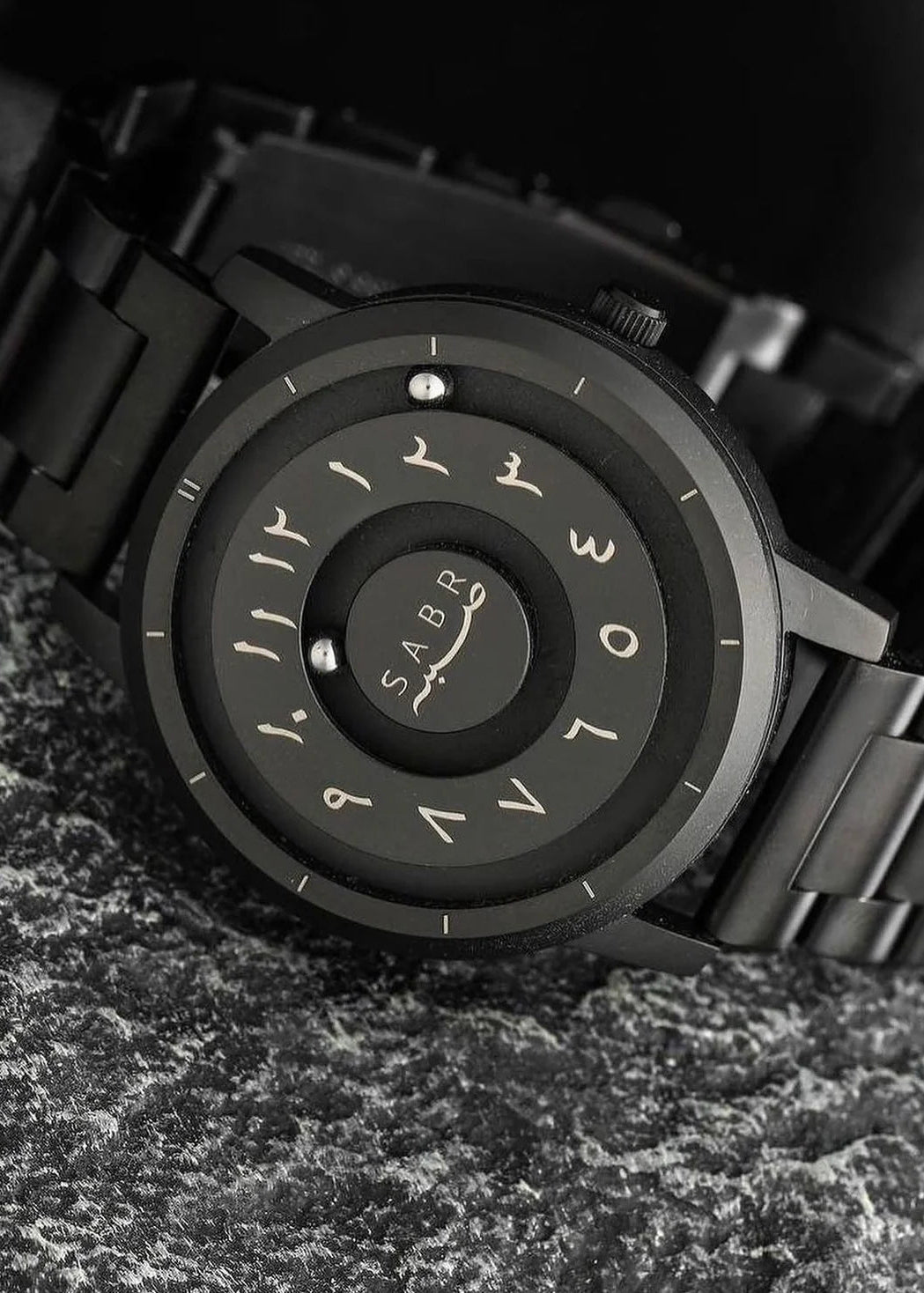 Adding to its exclusivity, the watch showcases an Arabic Aura font, enhancing its sophisticated aesthetic. Eye-catching and truly unique, the SABR Armless Watch is perfect for those who appreciate style, innovation, and a touch of modern minimalism.